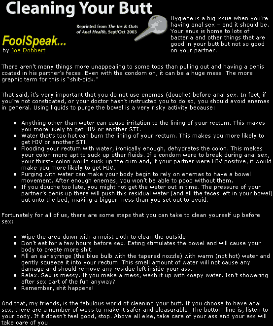 +15 years has passed since I published the above humorous take on the opening article (supposedly written for the benefit of the "gay male community" about "anal hygiene"). This was brought back to my attention because I recently read an article that was published containing all of the mindless nonsense as the former written by Dobbert.